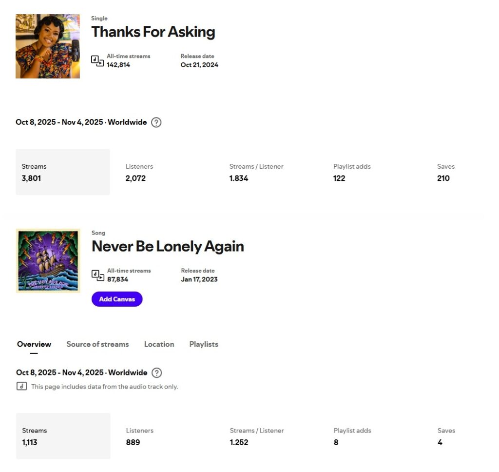 I'm back in the mode of promoting on Meta. I took a class last month and feel a lot more confident. My two most successful songs in Spotify are "Rojenka - Thanks For Asking" (which I'm currently running ads for) and "Geoff Bradford - Never Be Lonely Again" (which I'm not, but will probably get back to once I have something working for JTH)